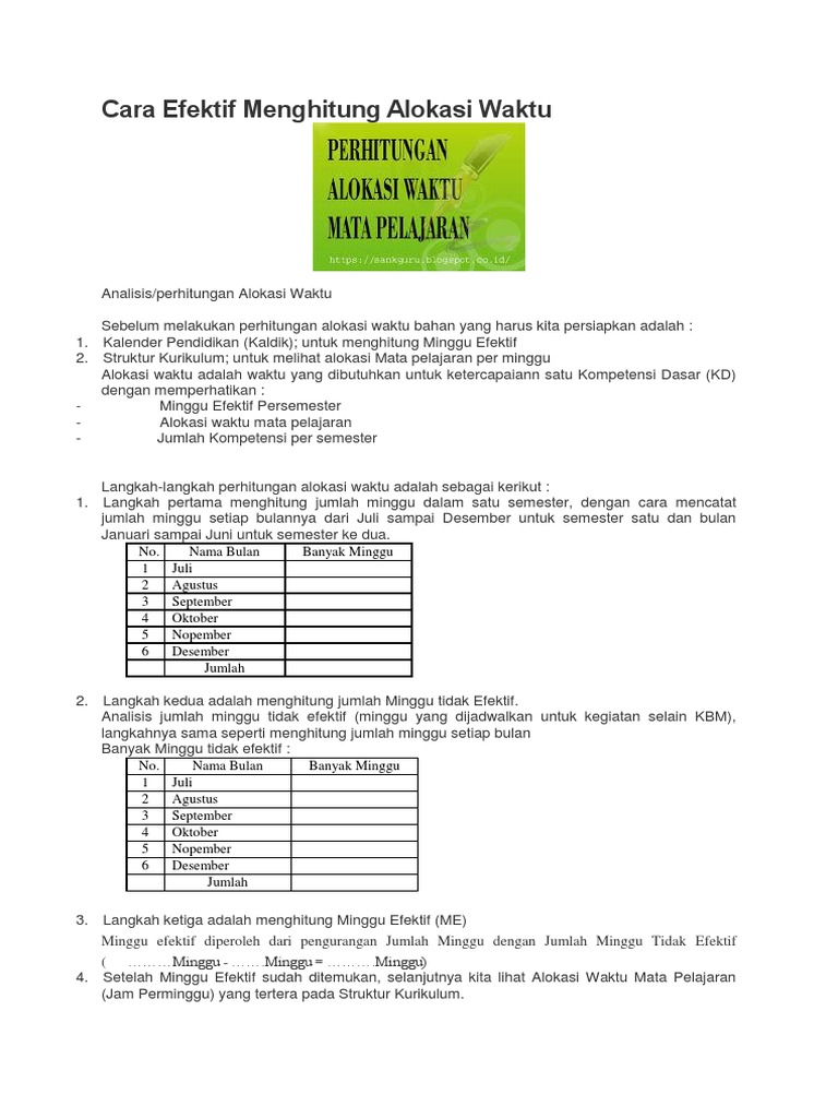Cara menghitung alokasi waktu kegiatan pembelajaran pada kalender pendidikan ini merupakan update terbaru brankasedukasi.blogspot.com yang akan kami bagikan pada kesempatan yang baik ini. Sedangkan dengan membuat rancangan pembelajaran yang tidak fleksibel, anda akan bingung dalam menentukan nilai atau alokasi waktu dalam laporan. Rpp menjadi panduan bagi seorang guru dalam mengembangkan kompetensi dasar (kd) menjadi indikator, menentukan pengalaman belajar yang sesuai, materi pokok pembelajaran, menentukan bentuk, teknik dan instrument pembelajaran berdasarkan alokasi waktu dan sumber belajar. 10 jam pelajaran (5 pertemuan) a. Doc alokasi waktu 2 x 45 menit 2 kali pertemuan nunung.