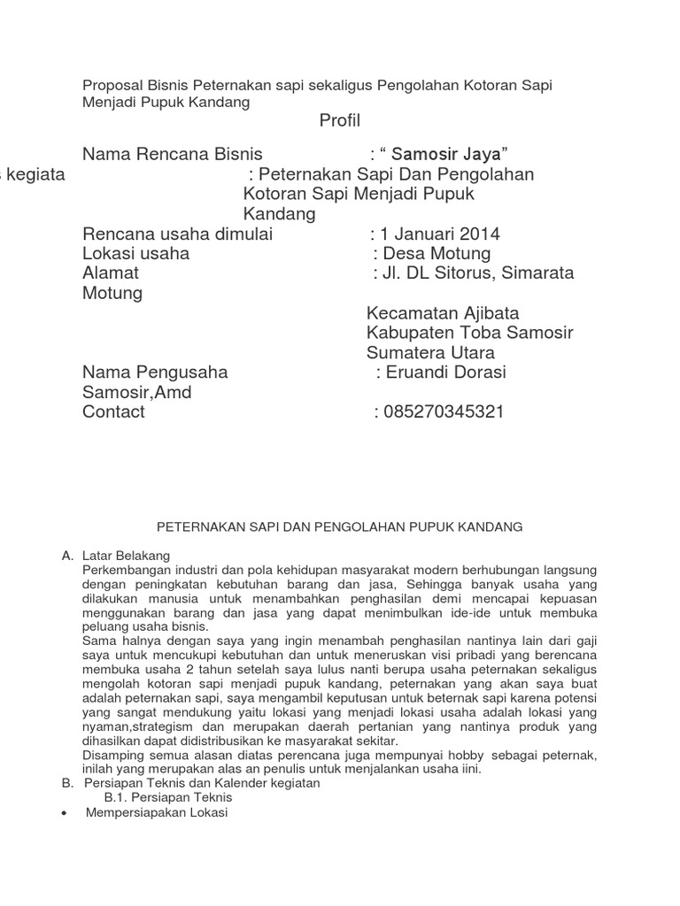 Dalam rangka meningkatkan usaha pembibitan sapi potong di kp.punaga jolokr t 02 rw 08 desa mandalakasih kecamatan mandalakasih kabupaten garut, maka kami kelompok ternak sapi punaga asih bermaksud mengajukan proposal bantuan hibah ternak sapi dengan harapan dapat meningkatkan pendapatan dalam usaha kami. Pendahuluan 1.1 latar belakang sejak konflik aceh yang melanda mulai tahun 1999, hingga di putuskannya darurat militer di aceh pada tahun 2003 sampai dengan datangnya musibah tsunami pada tahun 2004, masyarakat aceh terus hidup dalam kesusahan, sulitnya mengembangkan usaha di aceh kala itu diakui benar adanya oleh segenap lapisan masyarakat. Pada contoh proposal kemitraan diatas, kata kami silahkan diganti dengan nama anda atau perusahaan anda (pt / cv) atau nama kelompok tani jika proposal diajukan oleh kelompok tani. Usaha dirancang untuk menghasilkan 20 ekor sapi po ( peranakan ongole) setiap periode penggemukan. Ukuran kandang individu untuk satu ekor sapi meliputi, panjang 2,5 meter dan lebar 1,5 meter.